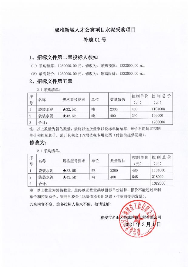 成雅新城人才公寓項目水泥采購項目補遺01號